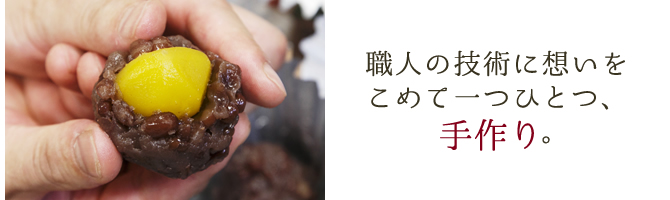 小豆を炊く、餡を煉る、栗をつつむ。 機械では作れない美味しさがあります。 気温や湿度、その日の素材の状態などから最もお客さん に「美味しい!」と感じていただけるように仕上げるのが 職人技。美味しさに想いをこめて。
